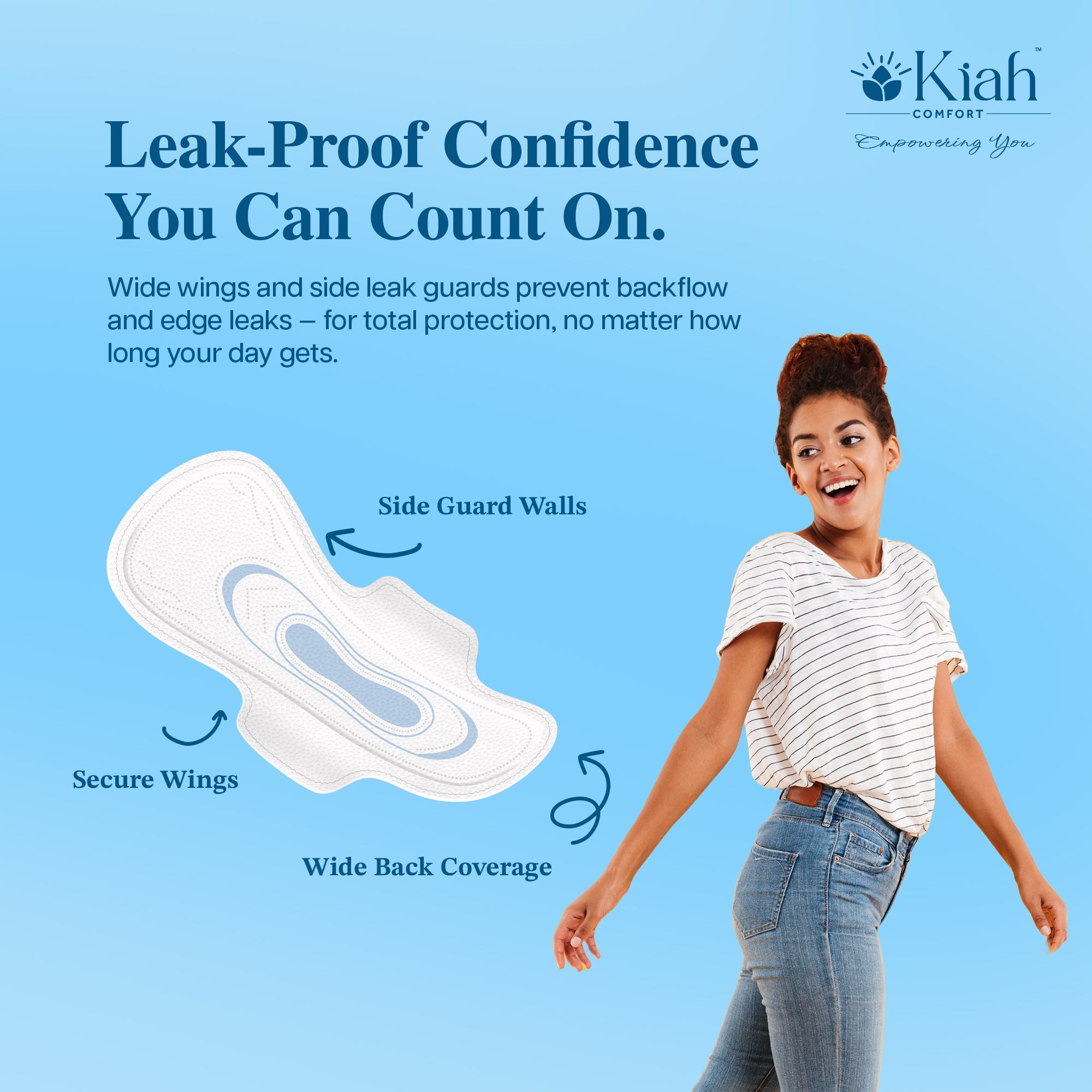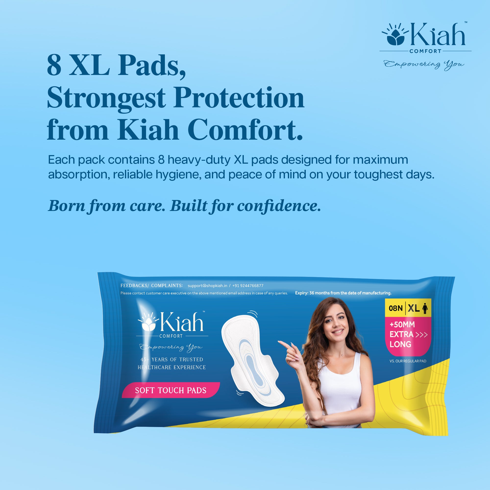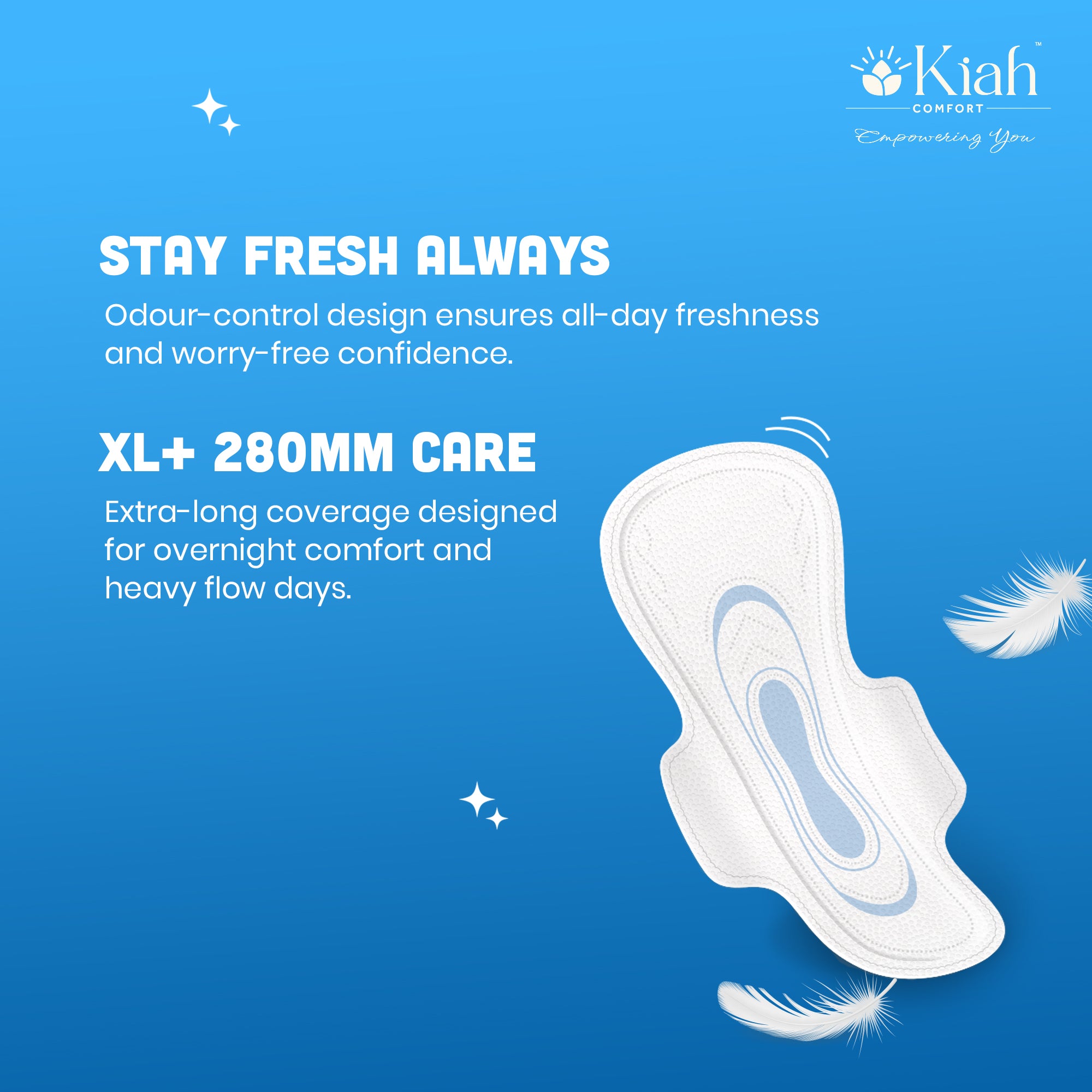 3x KIAH Soft Touch Pads (Dry Secure): Your daily go-to for maximum dryness. Featuring advanced gel-and-pulp technology, these pads lock in moisture instantly to keep you comfortable during active hours.