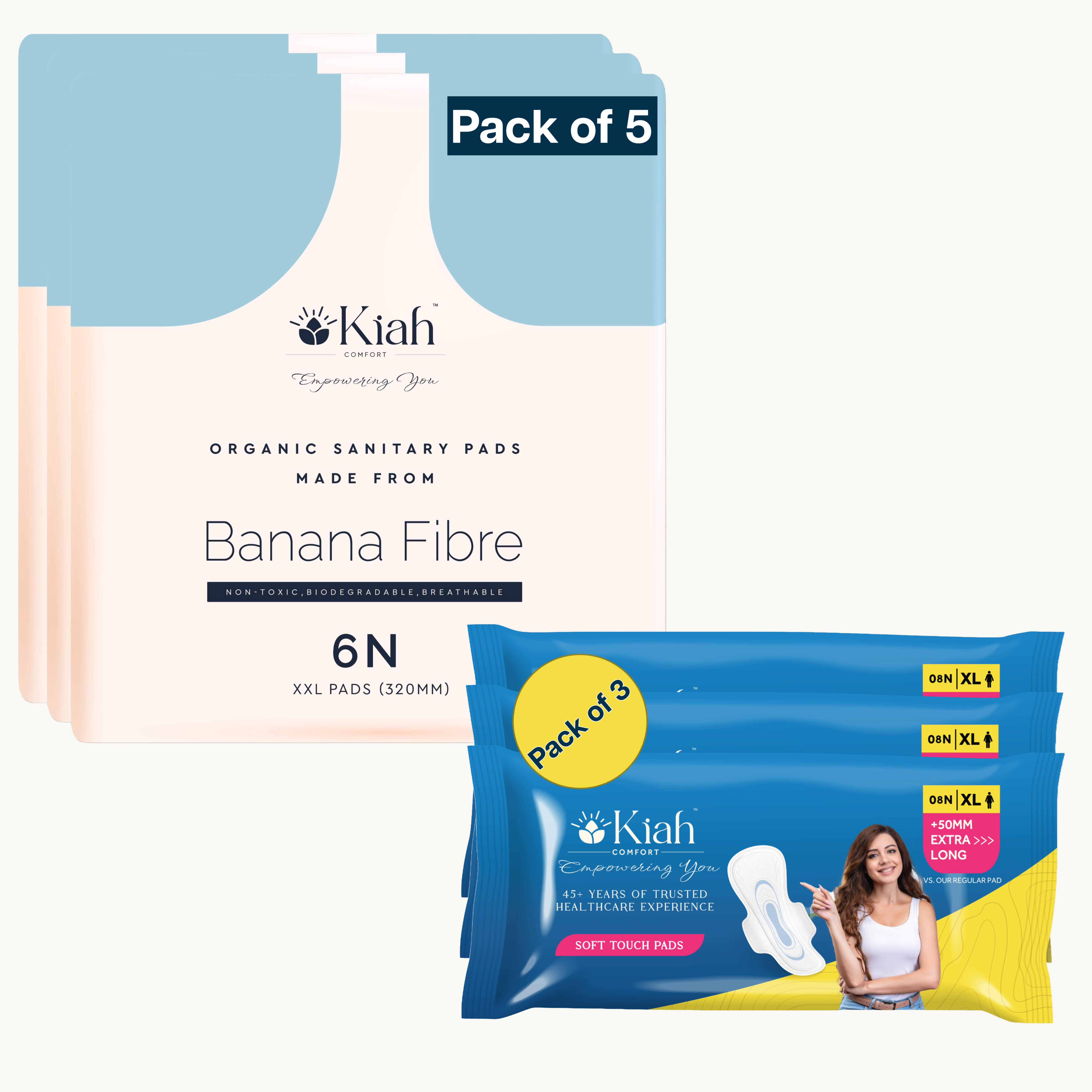 5x KIAH Organic Pads (XXL): Premium protection made from sustainable banana fibre. These extra-extra-large pads provide maximum coverage and are biodegradable and chemical-free.