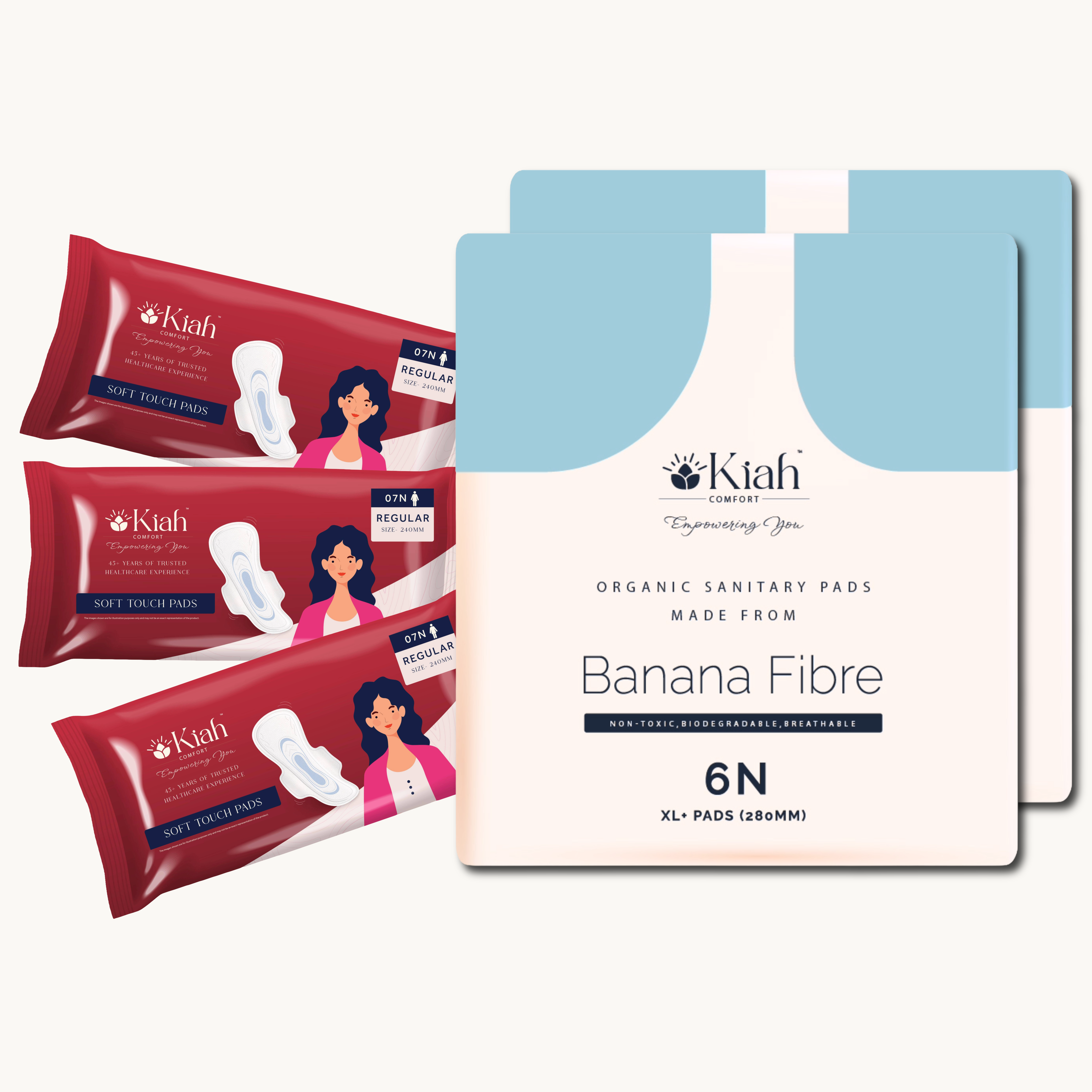 2x KIAH Organic Pads (XL - 280mm): Extra length for heavy days or overnight. Crafted from sustainable banana fibre, these are 100% biodegradable, chemical-free, and hypoallergenic.