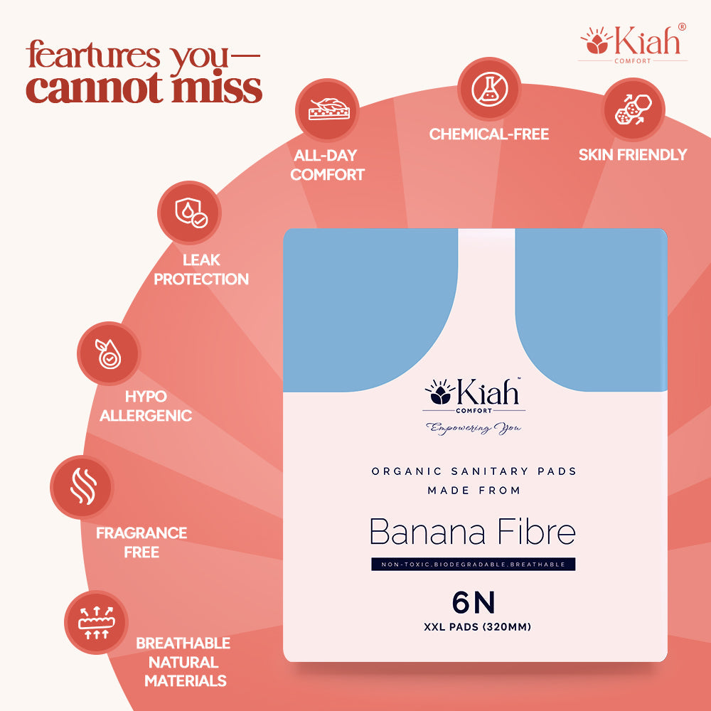 Made from Banana Fibre Introducing Kiah Comfort Organic Sanitary Pads, a revolution in feminine hygiene crafted from the finest natural materials. Made from breathable and sustainable banana fibre, these pads offer superior comfort, protection, and peace of mind, without harming the environment or your skin.