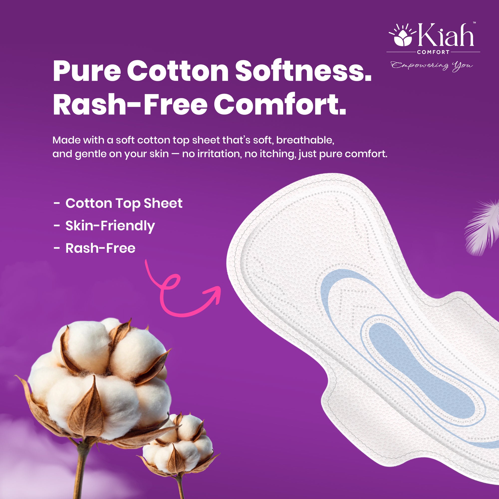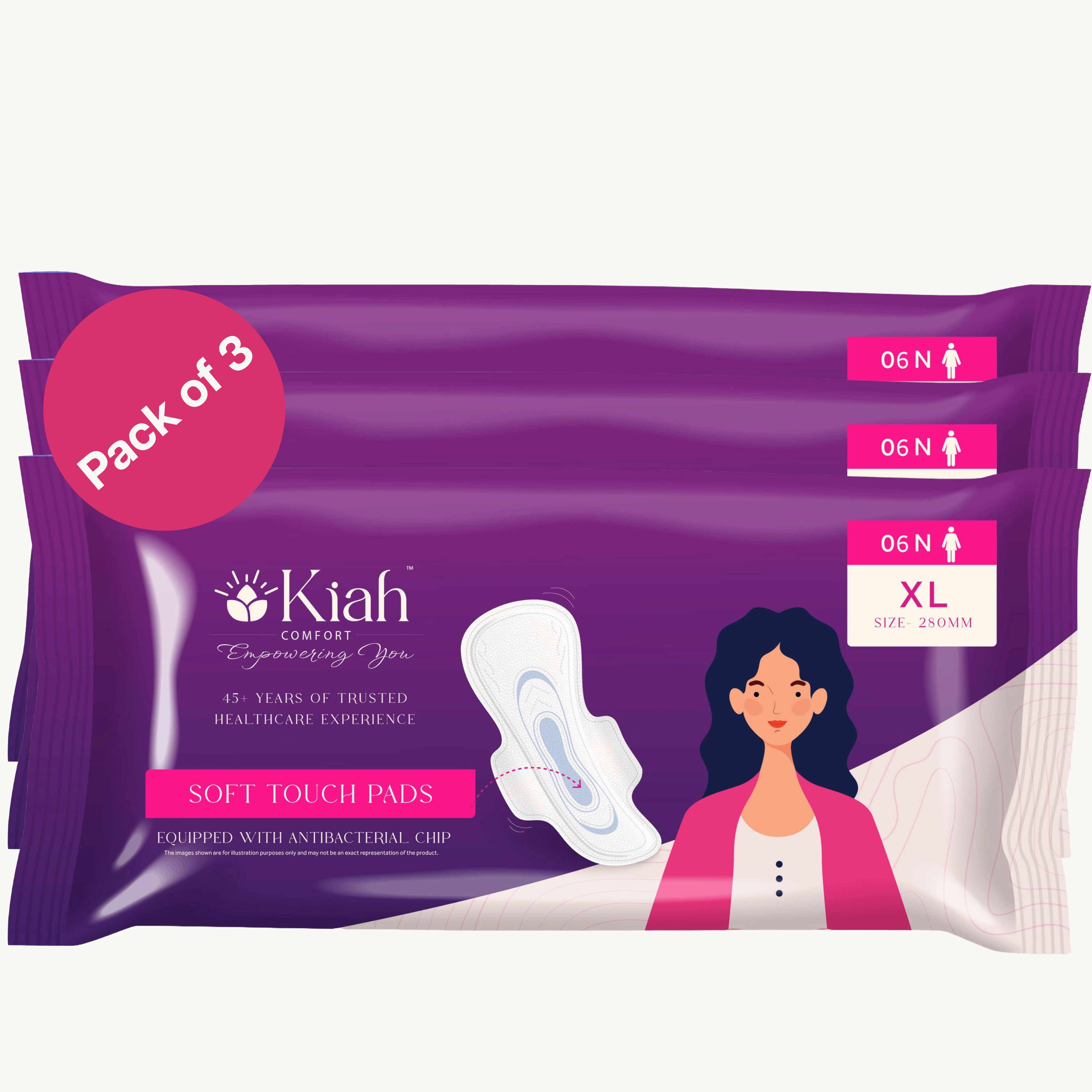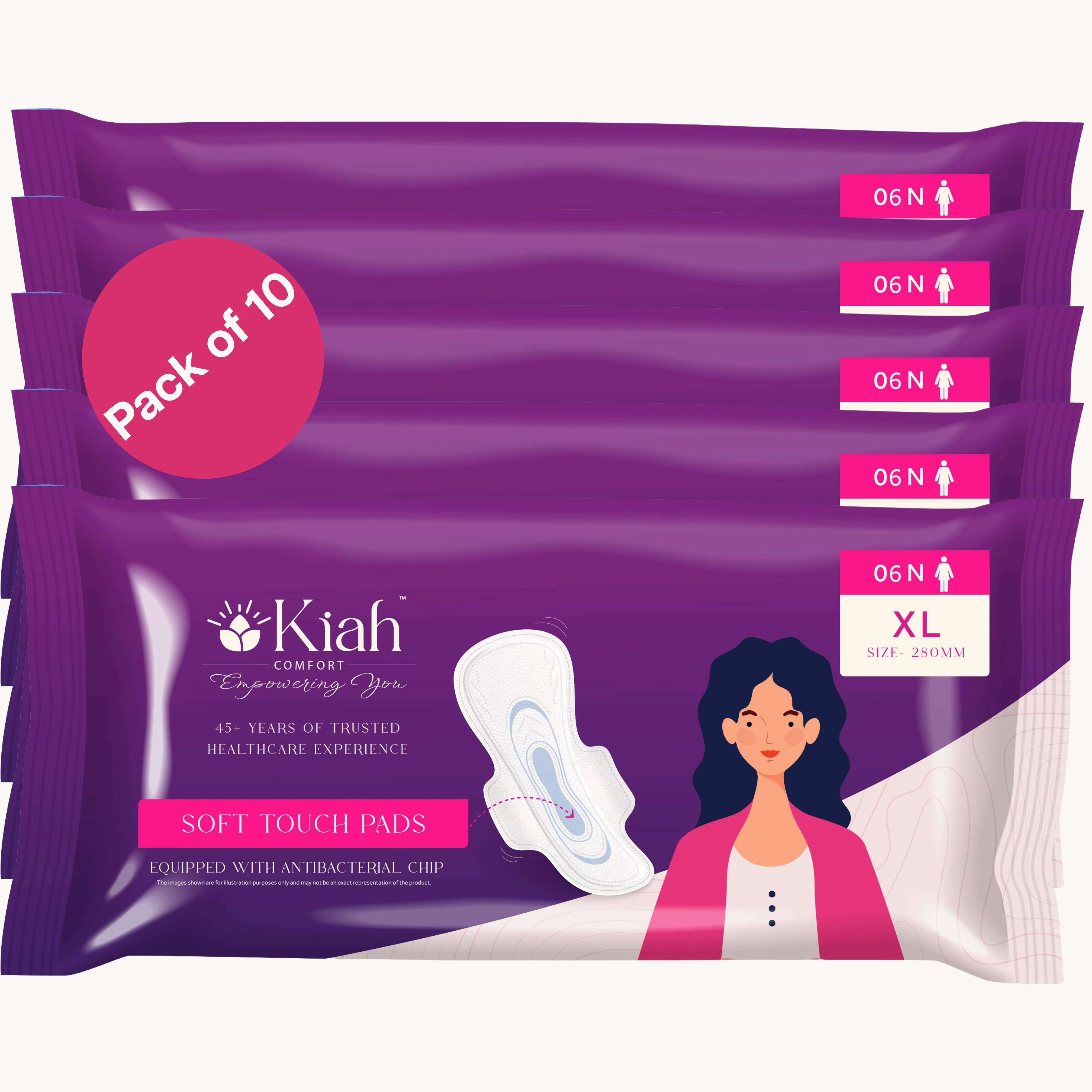 Cotton Soft, Economical & Reliable Protection Experience affordable comfort and superior protection with Kiah Comfort Soft Touch Sanitary Pads, specially designed for women seeking both quality and value. Made from soft, breathable cotton, these pads ensure a comfortable, rash-free experience, while offering advanced absorption technology for complete peace of mind during your period.